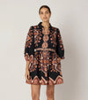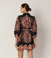 The garment is print placed at side seams, back bodice, center front placket, sleeves, shoulders and hem