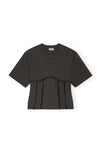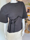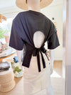 This black cotton tie back T- shirt features a round neckline, short sleeves, and a cut out back with tie detail.
