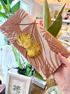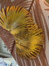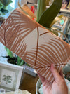 Brown and white palm fabric clutch with gold palm fronds snap closure. Crossbody gold chain included inside bag.