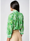 Style Notes: A favorite SMYTHE blouse, this season’s interpretation has been fabricated in a slightly diaphanous green print. When done all the way up, this silhouette features a sophisticated collar bridge.
